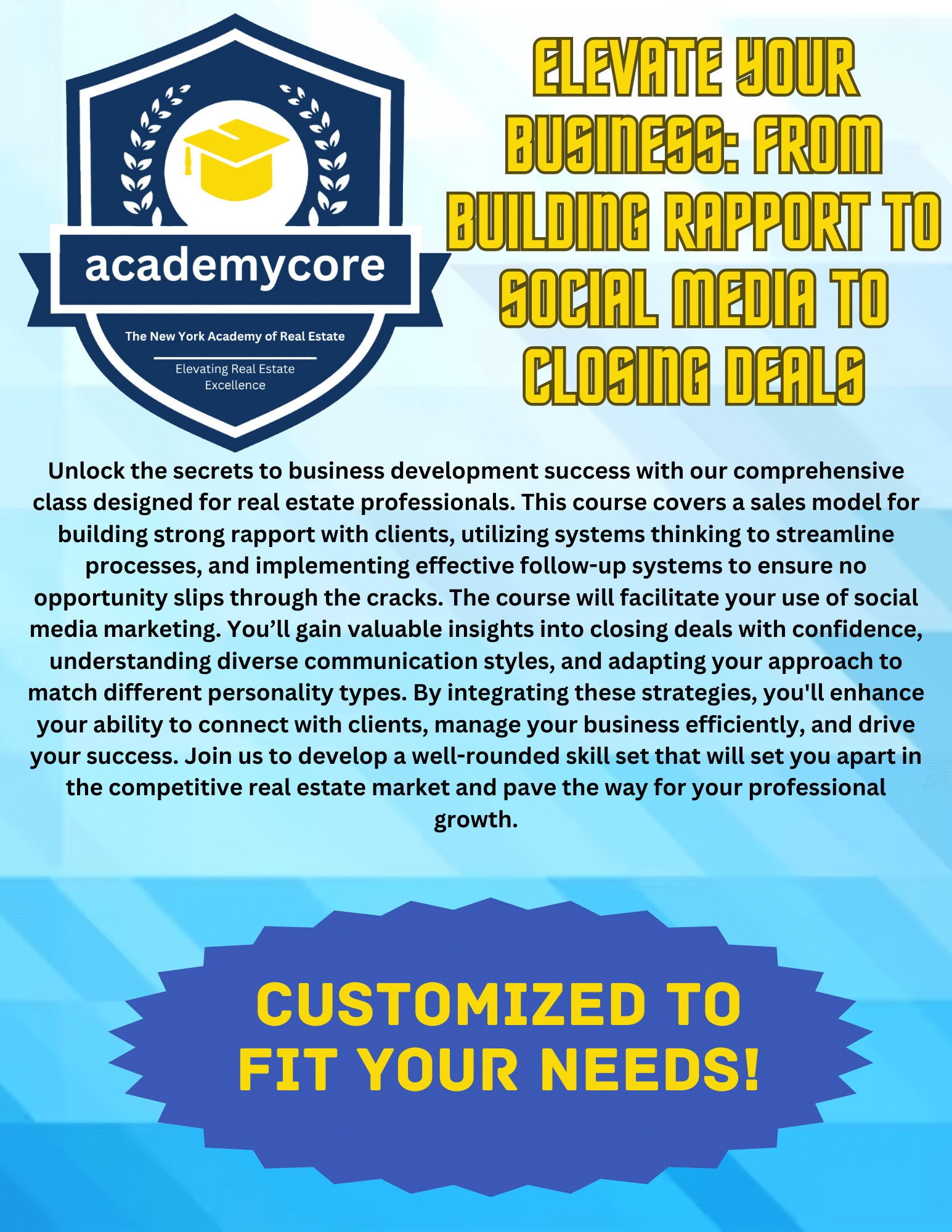 Unlock the secrets to business development success with our comprehensive class designed for real estate professionals. This course covers a sales model for building strong rapport with clients, utilizing systems thinking to streamline processes, and implementing effective follow-up systems to ensure no opportunity slips through the cracks. The course will facilitate your use of social media marketing. You’ll gain valuable insights into closing deals with confidence, understanding diverse communication styles, and adapting your approach to match different personality types. By integrating these strategies, you’ll enhance your ability to connect with clients, manage your business efficiently, and drive your success. Join us to develop a well-rounded skill set that will set you apart in the competitive real estate market and pave the way for your professional growth.