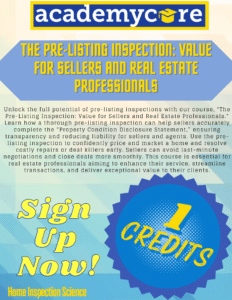 Unlock the full potential of pre-listing inspections with our course, “The Pre-Listing Inspection: Value for Sellers and Real Estate Professionals.” Learn how a thorough pre-listing inspection can help sellers accurately complete the “Property Condition Disclosure Statement,” ensuring transparency and reducing liability for sellers and agents. Use the pre-listing inspection to confidently price and market a home and resolve costly repairs or deal killers early. Sellers can avoid last-minute negotiations and close deals more smoothly. This course is essential for real estate professionals aiming to enhance their service, streamline transactions, and deliver exceptional value to their clients.